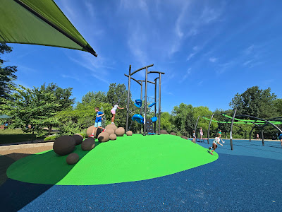 Central Park in Chesterfield has a very large playground with areas for all ages. The park also has an aquatic center, an outdoor amphitheater, a lake, and a creek. The playground was replaced in mid-2025.