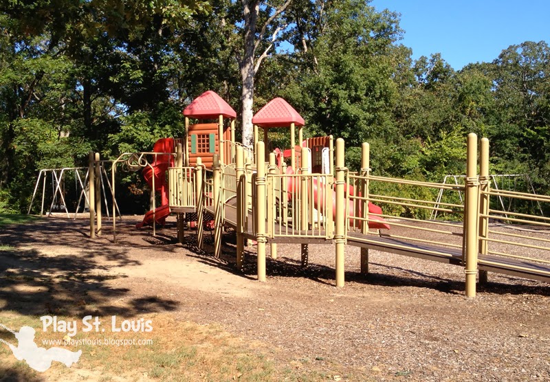 This large playground is partly shaded and huge! There is a toddler area with several smaller slides and a "fort" theme. There are 4 baby swings and 4 sling swings. A picnic shelter and restrooms are adjacent to the playground area. The playground gets some shade, you can tell it used to get more because there are several stumps of large trees that must have died and been cut down since the playground was built. There are also lots of benches in the center of the playground area for parents.