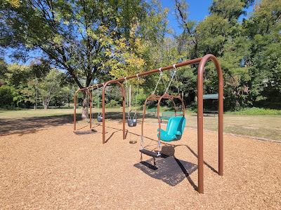 This park has a small playground for little kids under 5. It was redone in 2022. The play structure has several slides, a rock wall, and several bars and poles.