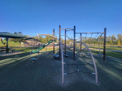 The third playground was renovated in 2024 and is near the Lions Shelter. It is partly shaded and so nice. It has an expression swing, 2 sling swings, a spinner, floating steps, slides, and tons of things to climb on.