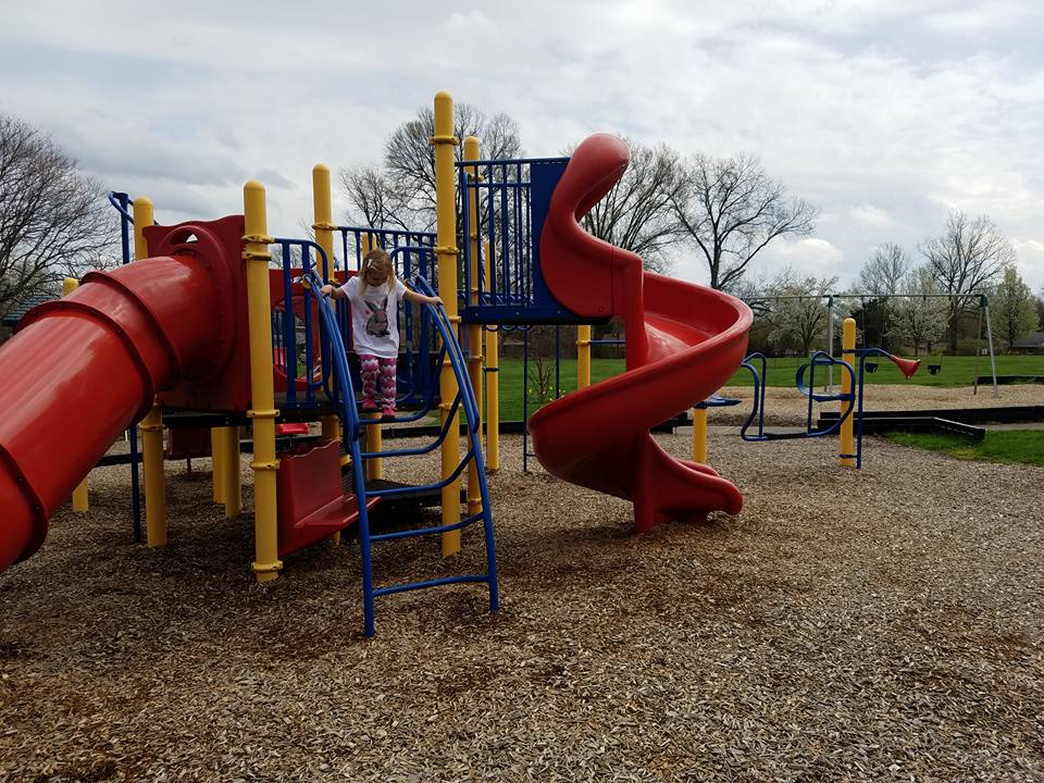 The play structure is older and has slides, a rock wall, a tic-tac-toe board, a bridge, and floating steps.