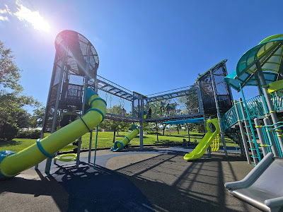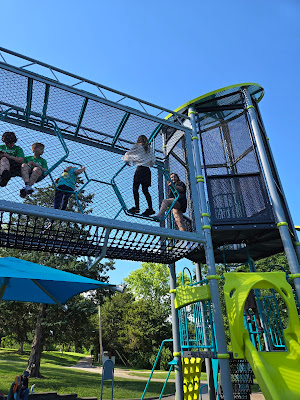 The play structure has a bridge, pretend windows of a train station, a fire engine, and police. There are tic-tac-toe boards, steering wheels, a bubble window, and bars and poles.